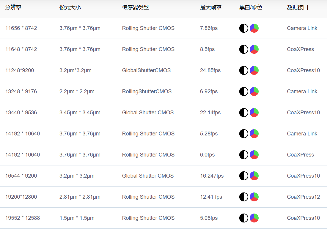 分辨率1.01-13.59億像素,支持Camera Link、CoaXPress等數(shù)據(jù)接口,支持黑白、彩色圖像模式,最高幀率可達(dá)24fps,支持像素合并、平場校正、視差矯正、空間校正等多種算法處理技術(shù),支持電子制冷功能。