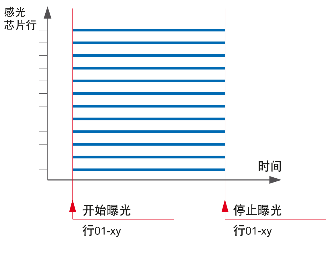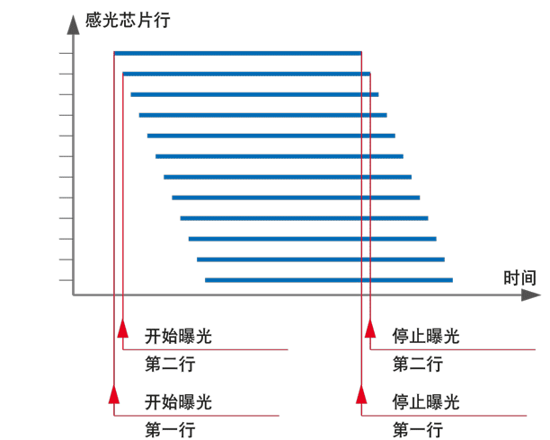 對于滾動快門,曝光時間不會同時開始和結(jié)束,而是按行分別進(jìn)行: 圖解顯示了相片上各行的逐行曝光。