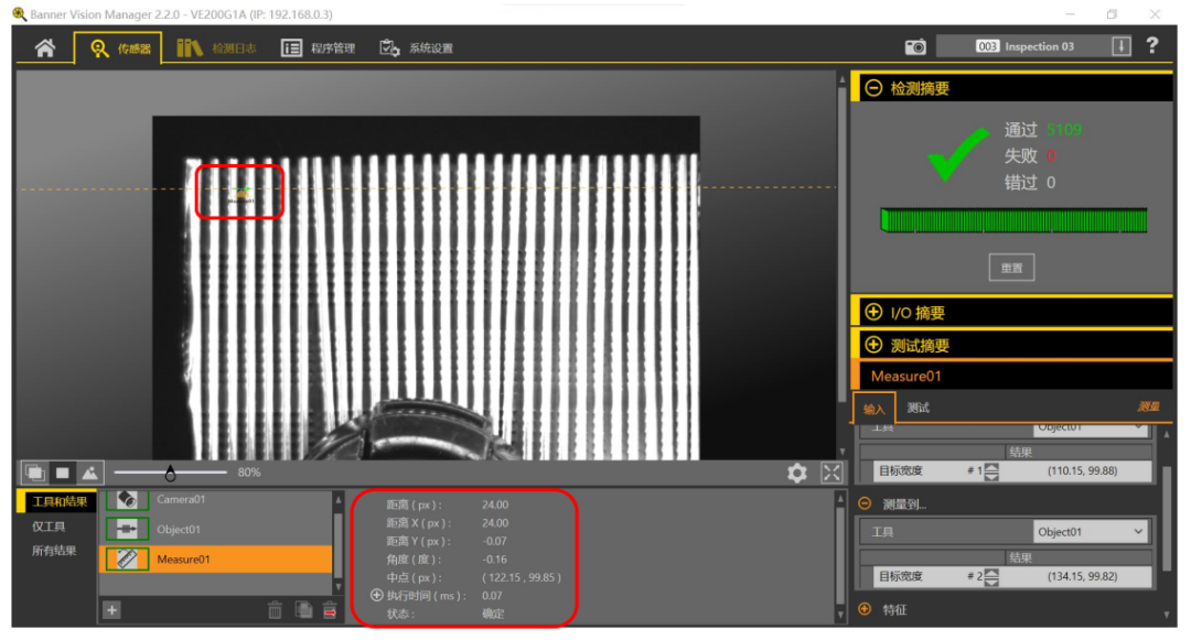 使用測量工具對凸起的兩個(gè)相鄰的亮點(diǎn)進(jìn)行檢測,并輸出總測量值。