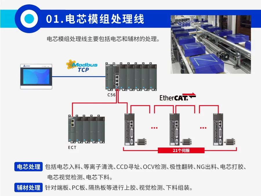 合信針對鋰電PACK線生產(chǎn)控制要求,提供PLC+伺服+HMI整套控制系統(tǒng)。