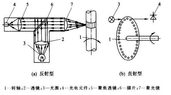 數(shù)字式光電傳感器 (1)光電轉(zhuǎn)速傳感器 光電式轉(zhuǎn)速計(jì)將轉(zhuǎn)速的變化變換成光通量的變化,再經(jīng)光電元件轉(zhuǎn)換成電量的變化。根據(jù)其工作方式可分為反射型和直射型兩類。 反射型光電轉(zhuǎn)速計(jì)的工作